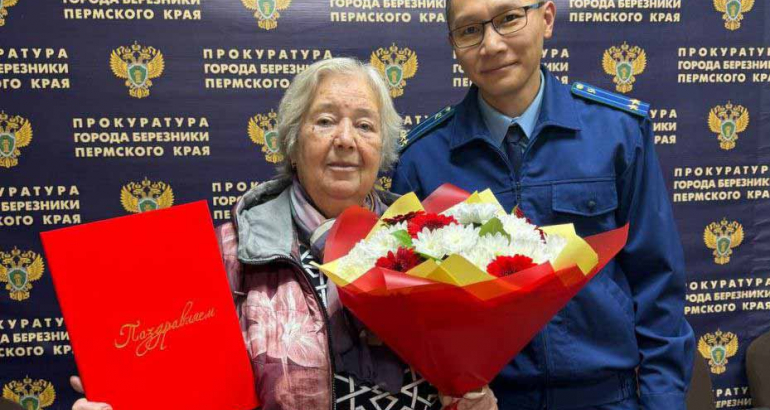 Исполняющий обязанности городского прокурора Сергей Пак пожелал ей крепкого здоровья, благополучия, а также передал имениннице поздравление от прокурора Пермского края Павла Бухтоярова и вручил ей благодарственное письмо.